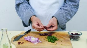 - اغسل وجاف البقدونس ، وطحن بسكين. البصل الأحمر قشر وختم رقيقة. انزع البذور من الزيتون.