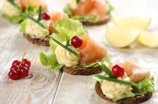 شطائر السلمون المدخن الصغيرة الجميلة والمدهشة ، مع المايونيز والزبدة والخس الجدول عطلة. تزيين المقبلات مع التوت الأحمر المجمدة الكشمش والثوم المعمر.