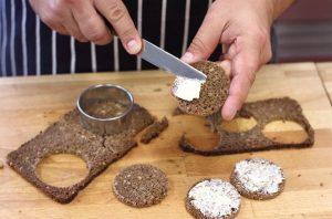 من شرائح رقيقة من قطع الخبز Borodino الكعكة قطع دوائر صغيرة (10 قطع) والشحوم مع الزبدة.