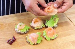نقطع السلمون إلى شرائح رفيعة. على الدوائر المعدة وضع أوراق السلطة الخضراء وشريحة من سمك السلمون ، وتشكيل زهرة.