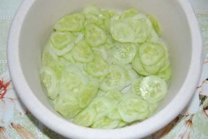 قشر الخيار الطازج ، مقطّعًا إلى دوائر رقيقة وأرسله في وعاء.
