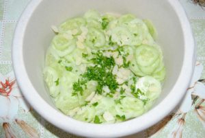 يُقطّع الزيتون إلى حلقات ويُرسل إلى الخيار ويُضاف مزيج الثوم العطري ، تخلط جيدا وسلطة منعشة جاهزة. ننشرها على الفور على طبق ، ونزينها بالبقدونس ونقدمها الجدول.