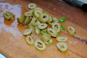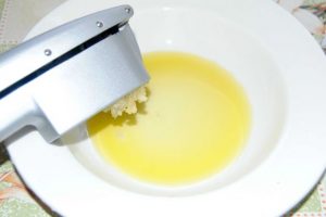 يُضاف الثوم المفروم إلى زيت الزيتون.