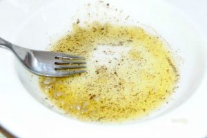 يتبل الزيت بالثوم والأعشاب بروفنسال والأرض الفلفل والملح (2 القرصات) وتخلط جيدا.
