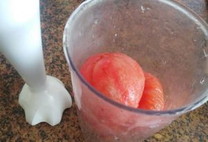 - قشر الطماطم من الجلد والبذور ، واخترق مع الخلاط.