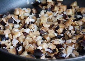 - نقطع الباذنجان إلى مكعبات صغيرة. انتشر الباذنجان في مقلاة للبصل والثوم. يضاف البهارات وينضج بانتظام تحريك الباذنجان حتى يصبح طريا.