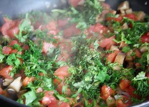 - نقوم بقطع لب الطماطم وإرساله إلى المقلاة ل الباذنجان مع الخضروات المفرومة ناعما. طبخ آخر 5 دقائق.