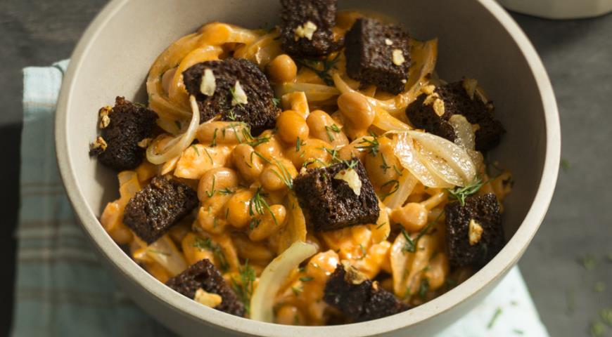 - تقطع خبز الجاودار إلى مكعبات وتقلى في مقلاة إضافة الزيت النباتي والثوم المفروم. يقلى حتى الدولة متموج.