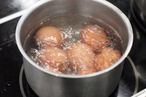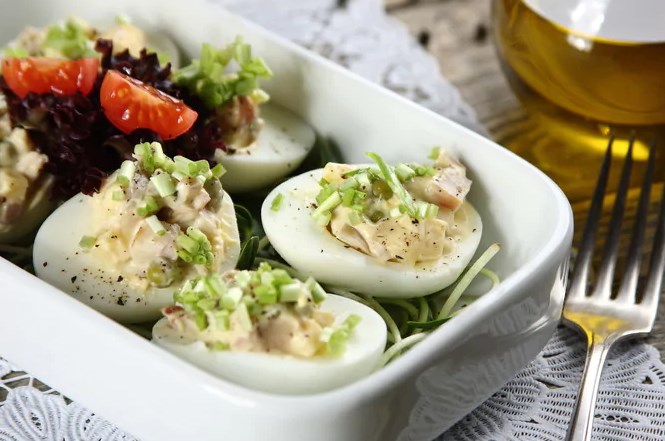 يُغلى بيض الدجاج لمدة 8-10 دقائق ، ويُقشر ويُقطع في النصف.