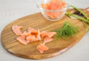 سمك السلمون المدخن مقطعة إلى شرائح رقيقة ، وتقسيم الشبت في اغصان صغيرة.