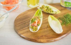 يتم إعداد مقبلات لذيذة في المنزل من أوراق الهندباء الطازجة ، سمك السلمون المدخن ، البازلاء المعلبة. سوف يصبح هذا الطبق الجدول الديكور احتفالي.