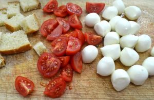 نقطع الخبز الأبيض إلى مكعبات ، طماطم كرزية في 4 أجزاء ، جبنة تستطيع موزاريلا أخذ كرة كبيرة وتقطيعها إلى قطع صغيرة (20 قطعة).