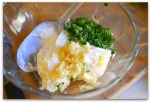 - دعونا نفعل الصلصة في الوقت الحالي. فرم الخضر ناعما في المايونيز و ضغط الثوم. إثارة.