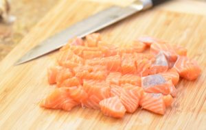 قطع السلمون المملح إلى مكعبات.
