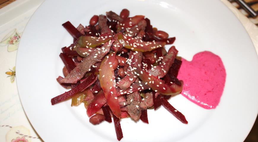 سلطة لذيذة مع اللسان وصلصة البنجر لطهي الطعام في المنزل وفقا لوصفتي هو سلطة piquant جدا على عشاء رومانسي. ومن الصلصة يمكنك عمل قلب!