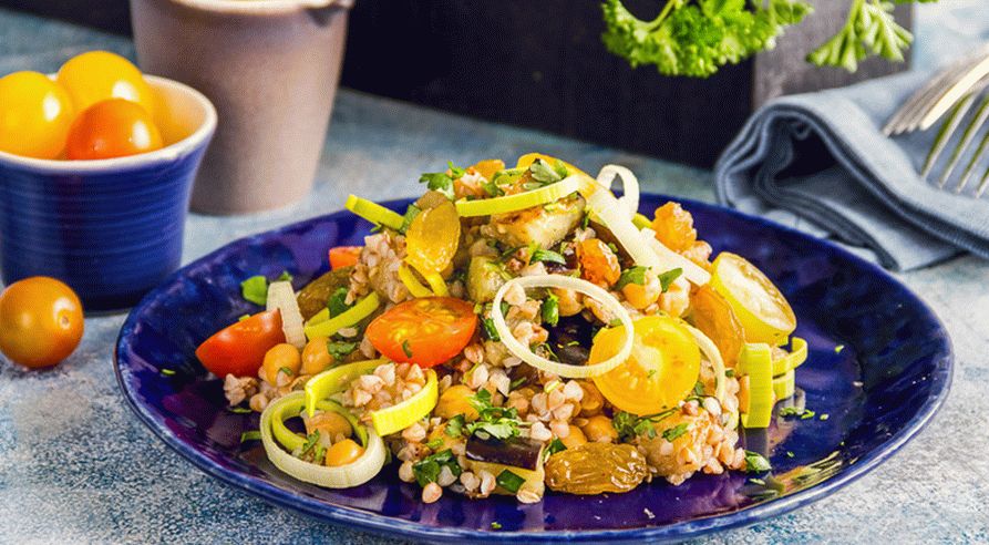 سلطة دافئة لذيذة مع الحنطة السوداء والحمص ، وهو أمر سهل لطهي الطعام في المنزل وفقا لوصفتي هو سلطة العجاف ومرضية ، والتي يمكن أن تقدم طبق كامل أو طبق جانبي ل لحم ، طائر!