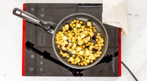 - اقطع الباذنجان الى مكعبات صغيرة ، ثم اقلي حوالي 5 دقائق ، إضافة الحمص المسلوق ويقلى كل شيء معا لا يزال حوالي 7 دقائق.
