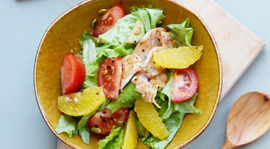 - نغسل أوراق الخس ونجففها ونضعها على طبق. من فوق نشر الطماطم والأفوكادو وشرائح البرتقال وصدر الدجاج. تُسكب السلطة فوق الصلصة المطهية وترشّ على الوجه بذور اليقطين.