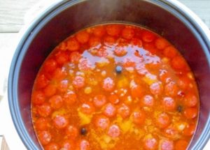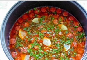 - شغِّل برنامج “الحساء” (30 دقيقة) ، وأضف توتراً مرق والبطاطا والزيتون والملح والفلفل.