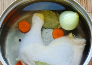 - صب الدجاج بالماء مع البهارات ، ورقة الغار ، البصل والجزر 1-2.