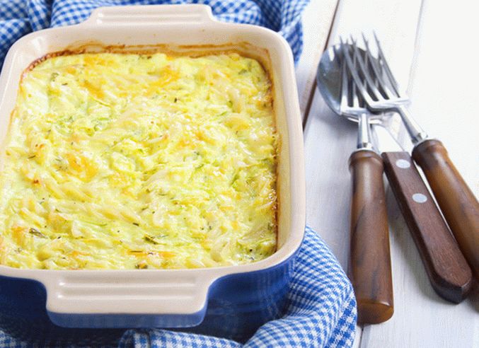 - ادهن صحن الخبز بالزيت. شقة على الجزء السفلي من العفن تنتشر نصف المعكرونة المسلوقة في طبقة. وضع المقبل خارج الطبقة لحم مفروم ، طبقة كوسة ، شرائح طماطم ضع الثاني في القمة نصف الشعرية. يرش بالجبن والأعشاب.
