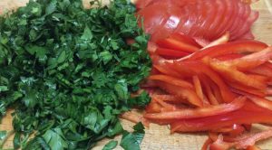 - اغسل الطماطم ومقطّعها إلى شرائح رفيعة ، واغسلي الفلفل ، وقشر من ذيل الأقسام والبذور ، مقطعة إلى شرائح ، والبقدونس ختم ناعما.