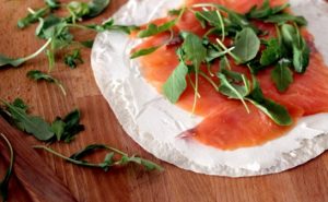 يضاف السلمون المملح الخفيف (½ جزء) إلى جبن الخثارة و يرش مع جرجير (جزء)).