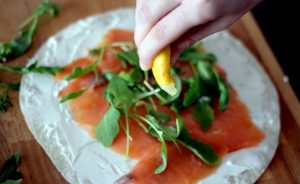 حول التورتيا مع السلمون والجرجير إلى لف ، لف فيلم بارد لمدة 2 ساعة.