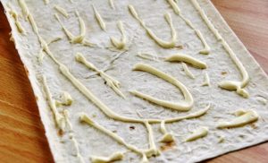 تشويه ورقة من خبز البيتا مع المايونيز ، إضافة الأعشاب والفطر مع البصل و الجبن. غطيها بخبز الخبز التالي وكرر طبقة الملء. فقط يجب أن تكون صفائح خبز البيتا ثلاثة.