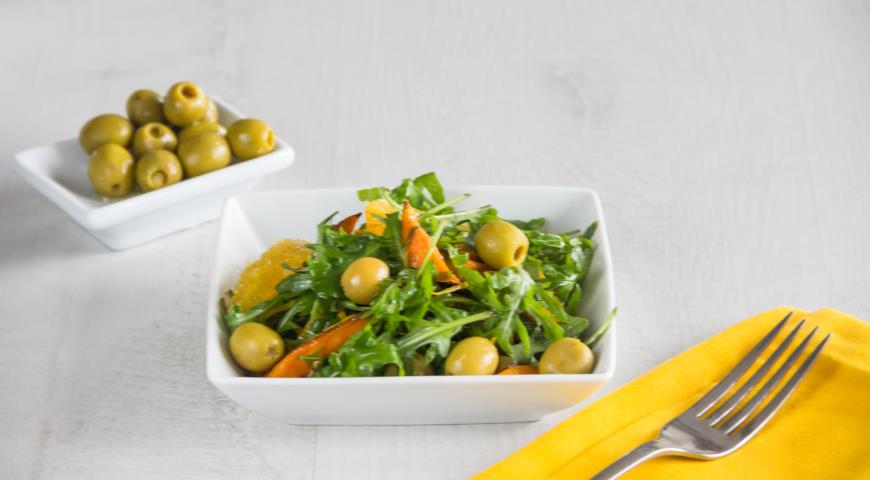 - قشر البرتقال ، ضعه على طبق وأزل اللب. نحن نغير الجزر ولب البرتقال والبرتقال والجرجير والماء سلطة خلع الملابس.