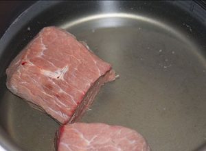 - شطف لحم الخنزير ، صر مع الملح والفلفل ويترك على نصف ساعة.