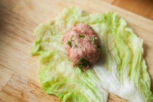 - نلف في كل ورقة ملعقة كبيرة من اللحم المفروم.