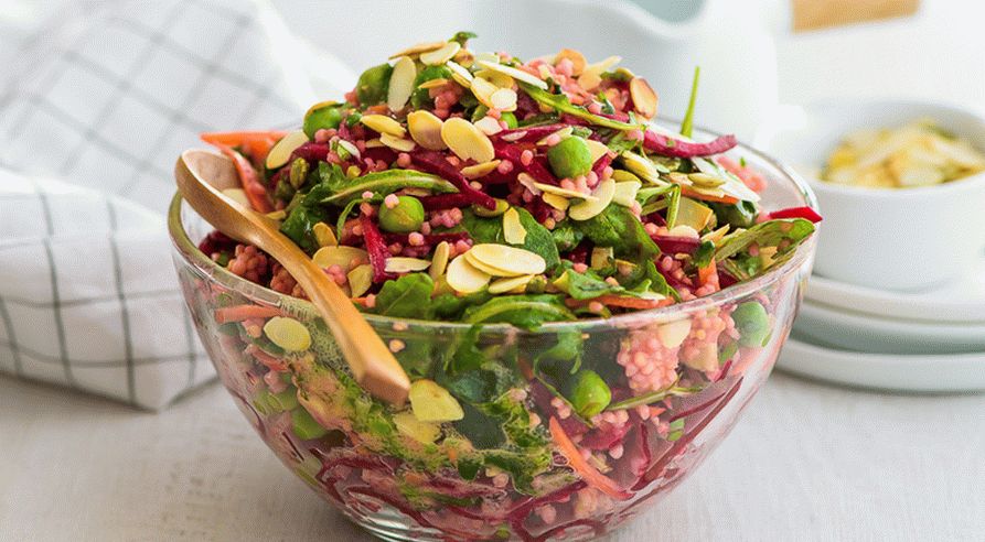 - في وعاء عميق ، اخلطي الجزر والبنجر والأفوكادو والبازلاء والدخن. أضف الجرجير وسكب الضمادة الناتجة. قبل يقدم مع بذور اليقطين واللوز.