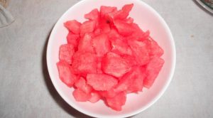 - قشر البطيخ ، وقطع اللحم إلى مكعبات.