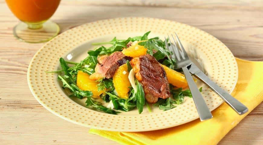 - قطع الثدي إلى شرائح رقيقة. سلطة المياه 2 ملاعق كبيرة ملاعق خلع الملابس ، ومزيج. نشر قطع البطة على القمة و برتقالي. أضف المزيد من الملابس.