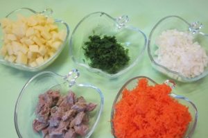 - نحن نقطع اللحم ونعد أيضًا المنتجات المتبقية: صر الجزر والبصل والشبت وقطع البطاطس.