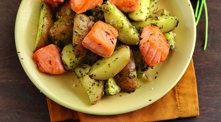 - تقطع شرائح السلمون إلى قطع صغيرة. عموم مع دافئة مع زيت الزيتون على نار عالية وإرسالها فيليه لدينا. يقلى 1 دقيقة على كل جانب. ننشر فيليه الانتهاء على منشفة ورقية.