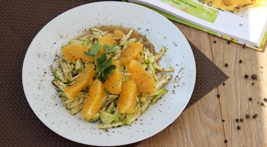 سلطة الكوسة اللذيذة مع البرتقال ليست صعبة على الإطلاق طبخ في المنزل. أنصحك أن تجعل هذه السلطة سريعة وصحية مع أكثر العصير البرتقال.