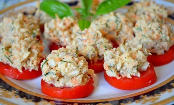 مقبلات لذيذة على الطاولة الاحتفالية. طبخ الطماطم في المنزل مع الماكريل المعلب والجزر والبصل والشبت المايونيز. جعلها ليست صعبة على الإطلاق.