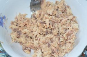 فتح الأغذية المعلبة ، واستنزاف السائل ، وقطع من الماكريل إرسالها إلى وعاء ومقطعة بشوكة.