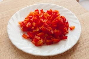 - تقطع الفلفل إلى نصفين ، ترفع النواة بالبذور ، شطف ومقطعة إلى مكعبات صغيرة.