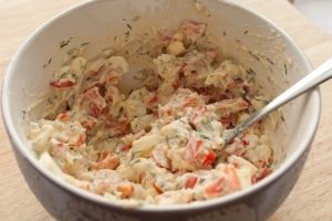 - في وعاء ، يُمزج البيض والفلفل المفروم مع المفروم الخضر والجبن.
