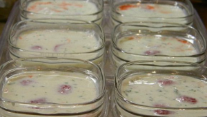 - توضع الفراولة في أسفل أكواب صانع الزبادي.