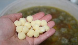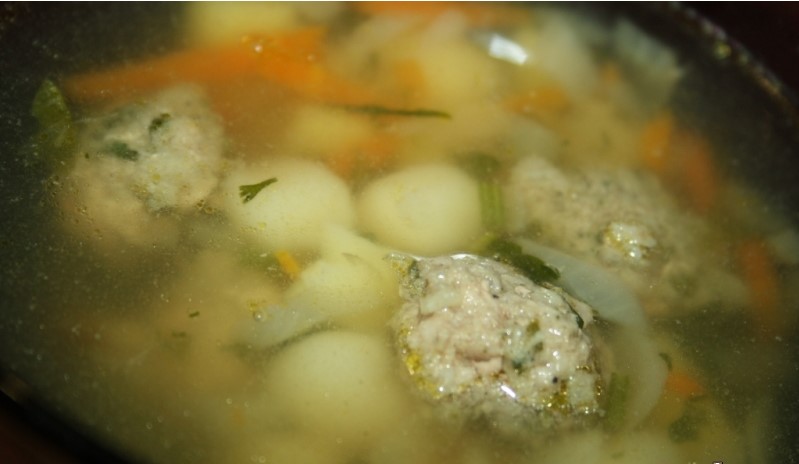 - بعد غلي البطاطس لمدة 5 دقائق ، يُضاف إلى الحساء كرات اللحم والملح والفلفل. الطبخ لمدة 8-10 دقائق.