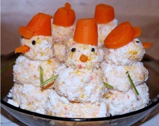 جعل ثلج يد من فروع البقدونس. عيون من البازلاء من الفلفل الأسود ، وصنبور من الجزر المسلوق.