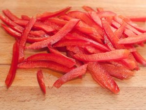 جرس الفلفل المقطّع إلى شرائح. وضعت على سلطة في النموذج الألوان.