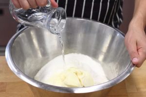 في وعاء عميق ، اخلطي الدقيق بالماء والمايونيز – يعجن العجين. إذا لزم الأمر ، إضافة المزيد من الماء إذا العجين صلب أو دقيق إذا كان العجين سائلاً.