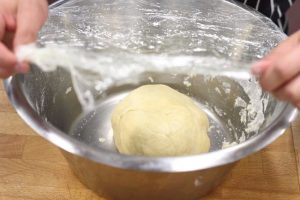 غطي العجين النهائي بفيلم التشبث وضعيه جانباً 20 دقيقة في درجة حرارة الغرفة.