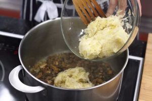 تقلى في مقلاة عميقة أو stewpan البصل ، ثم يضاف الملفوف والفطر و 600 مل من الماء. لوضع كل التوابل المفضلة لديك ، اطبخ حتى يصبح الملفوف لينة. ضع الحشوة النهائية جانباً بحيث يبرد.