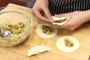 تأخذ جزء من العجين ، وجعل النقانق للخروج منه مع يديك. ثم قطع قطعة ~ 1.5 سم ولفة لهم بحيث اتضح حتى الدوائر. الآن تحتاج إلى وضع صغيرة كمية ملء وشكل الزلابية.